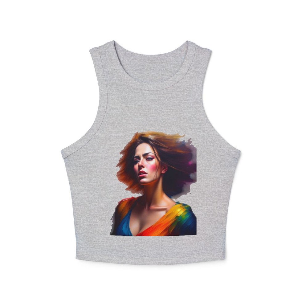 These custom women's tank tops are crafted with a premium blend of 52% Airlume combed and ring-spun cotton and 48% polyester, providing an ultra-soft, breathable feel. This fitted racer-back tank features a chic 1x1 micro ribbed texture, ensuring a flattering, snug fit. The high neck design offers a sleek, modern look, while the mid-length cut makes it perfect for layering or wearing on its own. Available in Athletic Heather, which consists of a 90/10 Airlume combed and ring-spun cotton/polyester blend, this tank top is the ideal blend of comfort and style for any casual or athletic occasion.